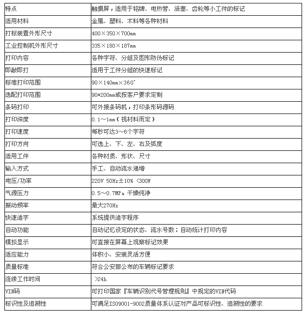打印針在壓縮空氣作用下作高頻振動(dòng)。沖擊工件,同時(shí)工業(yè)一體機(jī)控制二維運(yùn)動(dòng)機(jī)構(gòu)帶動(dòng)打印針按預(yù)設(shè)的軌跡運(yùn)動(dòng),從而在工件上形成字符和圖形。也可卸除旋轉(zhuǎn)頭可作為標(biāo)準(zhǔn)氣動(dòng)打標(biāo)機(jī)使用,軟件編輯功能強(qiáng)大,易學(xué)適用,可以編輯任意所需的字符和圖形、具備自動(dòng)打印日期和流水號(hào)等功能。